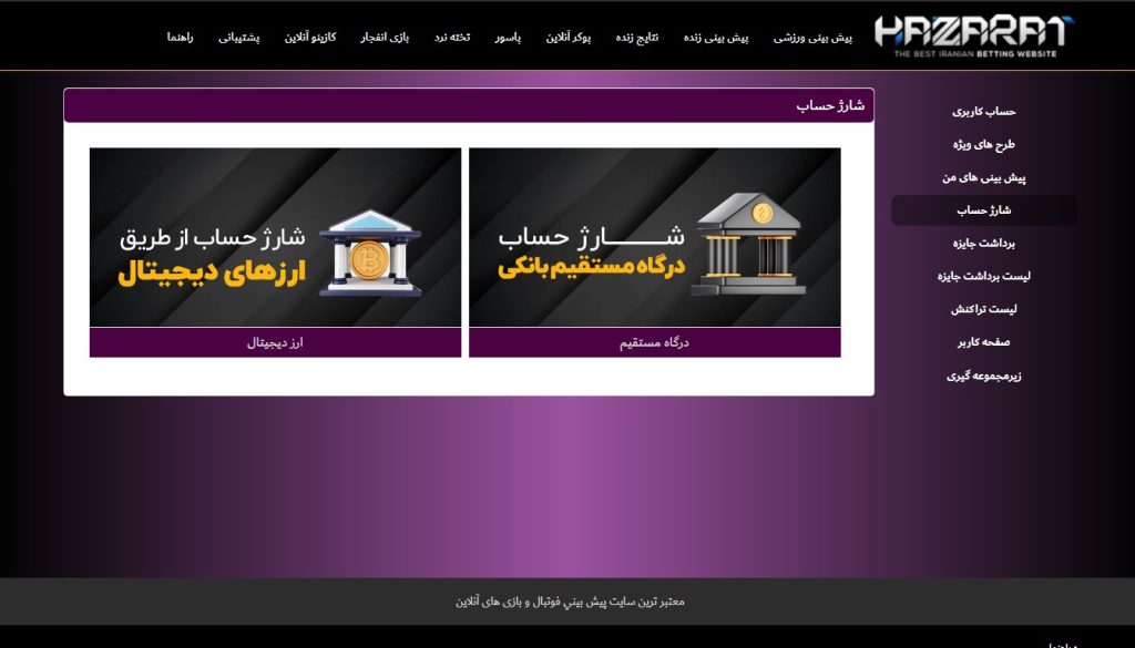 برای شروع فعالیت در حضرات بت، ابتدا باید حساب کاربری خود را شارژ کنید. سایت روش های امن و متنوعی برای افزایش موجودی ارائه کرده است که شامل درگاه بانکی، ارز دیجیتال مانند تتر و ترون و سایر روش های پرداخت می شود. این تنوع به کاربران امکان می دهد بر اساس شرایط خود بهترین گزینه را انتخاب کنند و بدون تاخیر وارد بازی ها و پیش بینی ها شوند.
