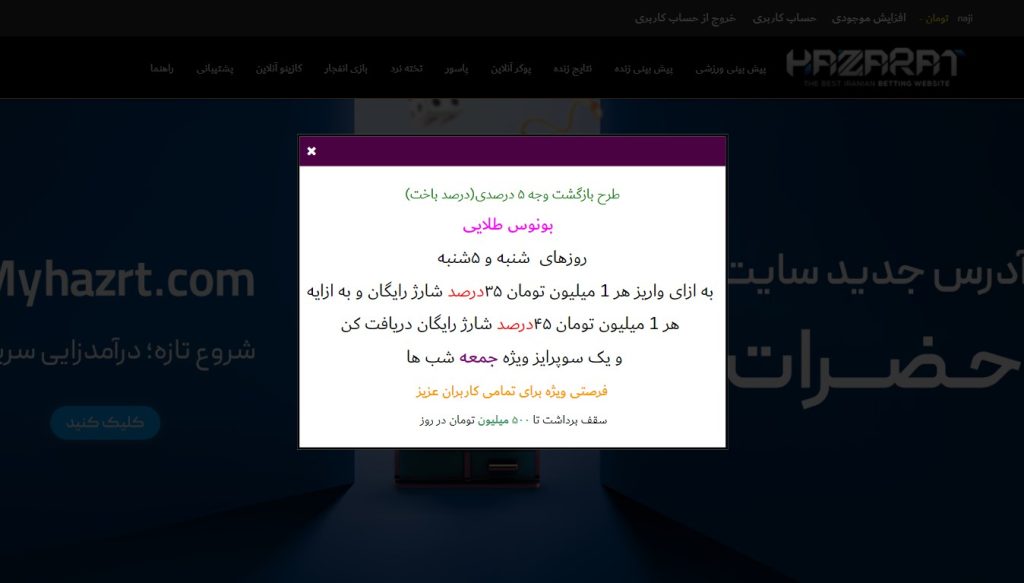 پس از ورود به حساب کاربری Hazarat Bet می توانید وارد بخش بونوس و جوایز شوید و طرح های فعال را مشاهده کنید. هر بونوس شرایط مخصوص خود را دارد و مطالعه ی آن کمک می کند استفاده ی درستی از جوایز داشته باشید. بونوس ها معمولا در بازی های کازینویی و پیش بینی ورزشی قابل استفاده هستند و در صورت استفاده ی هوشمندانه، باعث افزایش شانس موفقیت و تجربه ی بهتر در سایت می شوند.